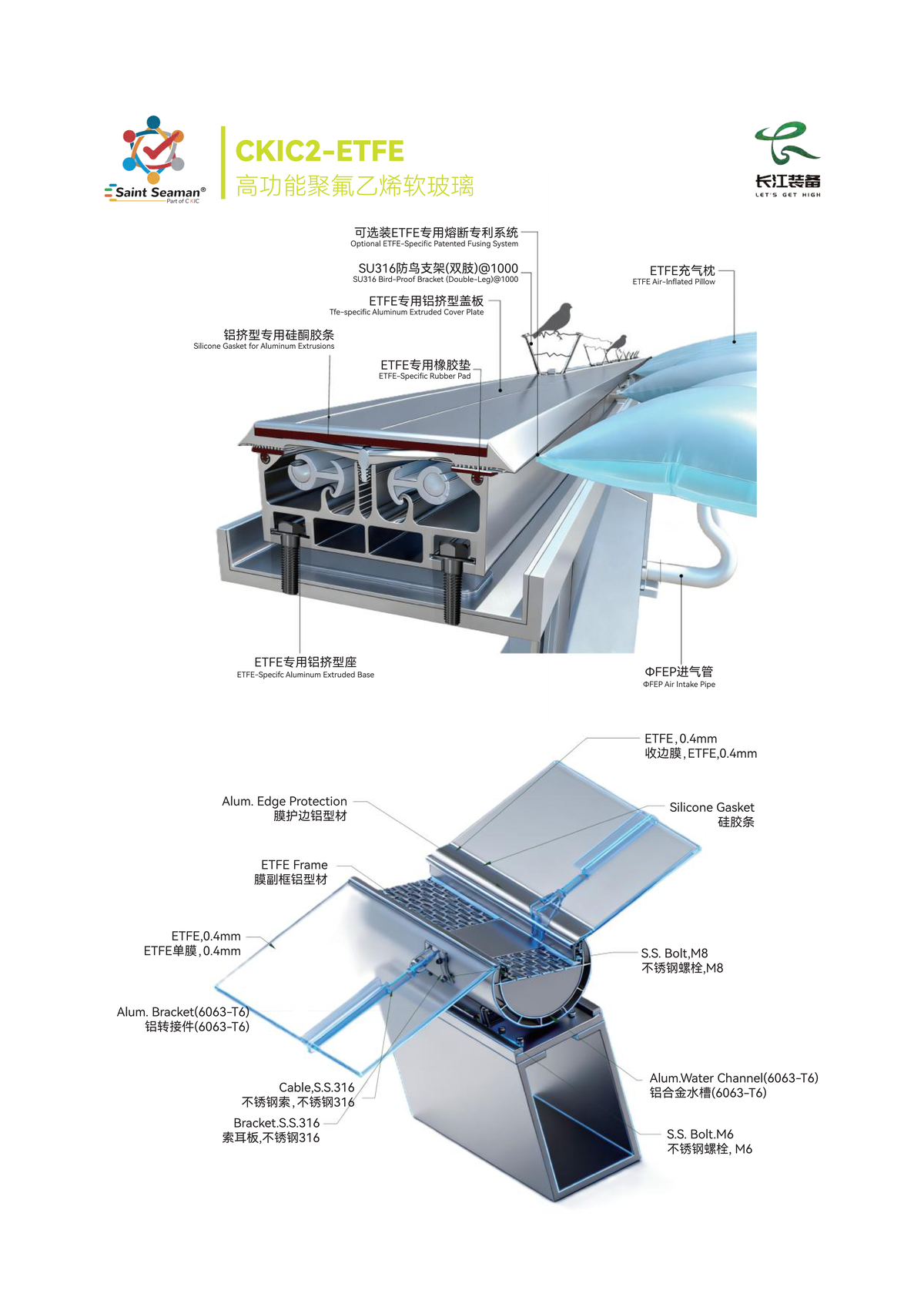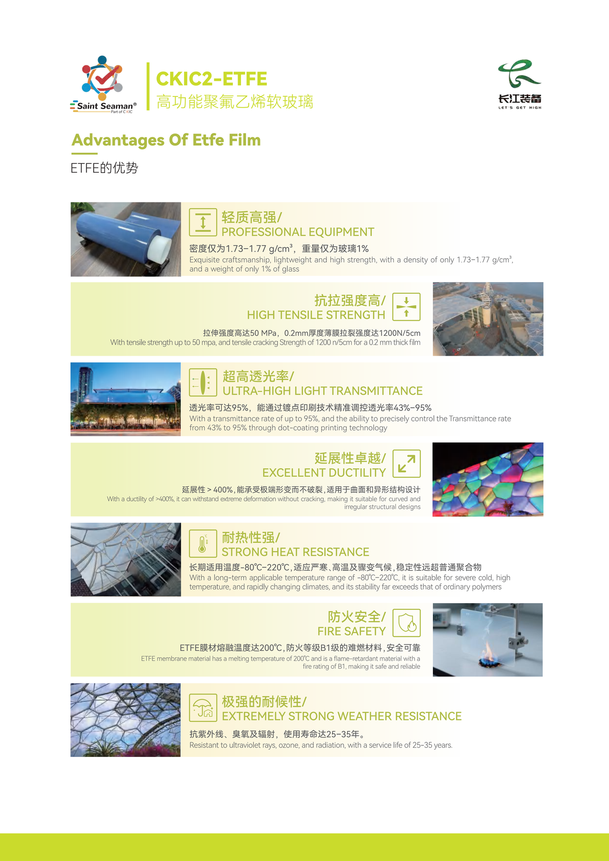 密度仅为1.73-1.77 q/cm’,重量仅为玻璃1%;拉伸强度高达50 MPa,0.2mm厚度薄膜拉裂强度达1200N/5cm;透光率可达95%,能通过镀点印刷技术精准调控透光率43%-95%;延展性>400%,能承受极端形变而不破裂,适用于曲面和异形结构设计;长期适用温度-80°℃-220℃,适应严寒、高温及骤变气候,稳定性远超普通聚合物;ETFE膜材熔融温度达200℃℃,防火等级B1级的难燃材料,安全可靠;抗紫外线、臭氧及辐射,使用寿命达25-35年。···