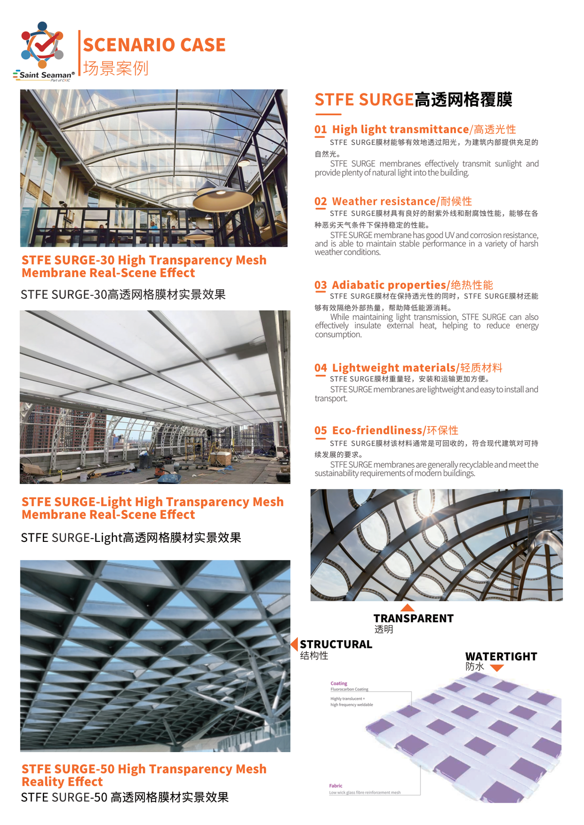 STFE SURGE membrane effectively transmits sunlight, providing ample natural daylighting for interior spaces. It offers excellent resistance to ultraviolet (UV) radiation and corrosion, ensuring stable performance even under harsh weather conditions. While maintaining high light transmittance, STFE SURGE also provides effective thermal insulation by blocking external heat gain, thereby helping to reduce energy consumption for cooling. The material is lightweight, making it easier to transport and install. Additionally, STFE SURGE is typically recyclable, aligning with modern architectural demands for sustainability and environmental responsibility.···